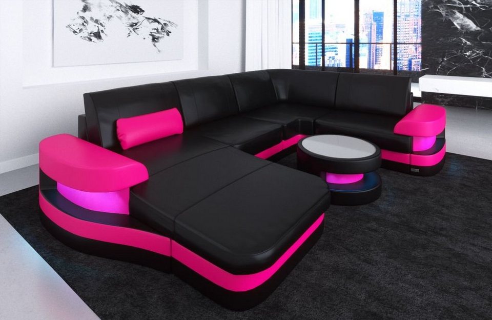 Details Zu Ecksofa Leder Designer Wohnlandschaft Monza U Form Schwarz Grau Led Beleuchtung